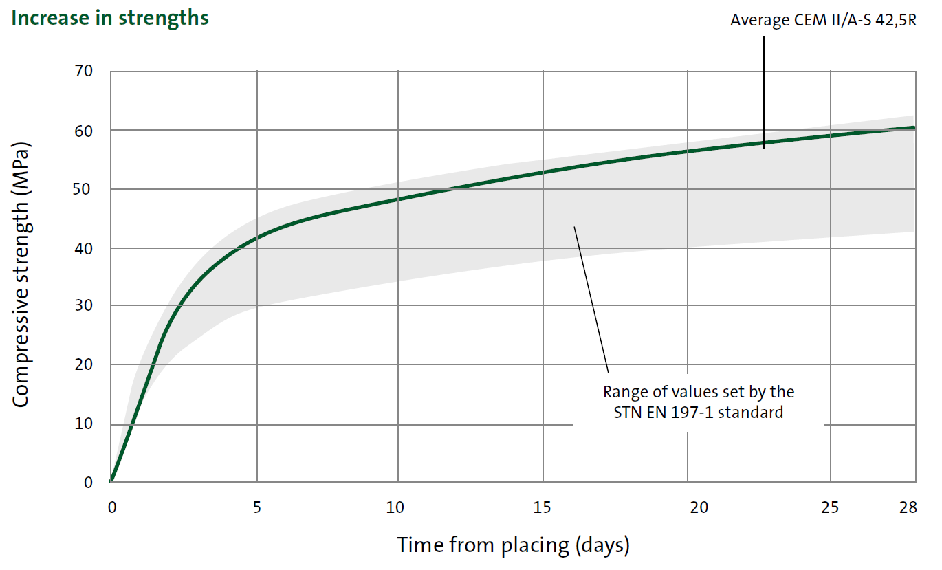 CEM II/A-S 42,5R is a cement produced by fine grinding of Portland clinker, granulated blast-furnace slag (6 – 20% according to EN 197-1) and gypsum. It attains 2-day strengths ranging from 25 to 29 MPa and standard 28-day strengths of 57 to 61 MPa.